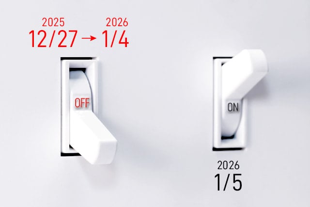 誠に勝手ながら、弊所では2025年12月27日(土)→2026年1月4日(日)までの期間を年末年始休業とさせていただきます。