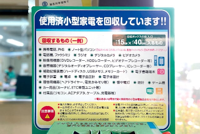 ② 小型家電回収ボックス(加古川市)へ投入①はメーカーに依頼して、梱包手続きなどは手間がかかるし...